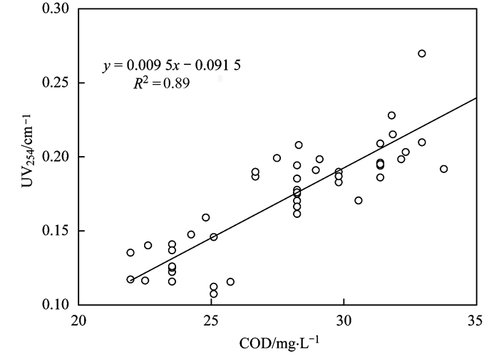 有研究表明, UV254與COD有一定的相關性, UV254值越小, 可生化性就越強, 水中復雜有機物分解及去除效果就越好.對本實驗數據進行COD與UV254之間離散關系分析如圖 3所示, 并得出相關系數為0.89, 說明COD與UV254之間具有強相關性.具體聯系污水寶或參見http://www.dowater.com更多相關技術文檔。