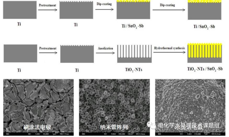 以Sb-SnO2陽極為例,有研究者使用稀土元素(Eu、Gd等)、Cd、Fe、Bi、Ni等能有效提升Sb-SnO2電極電催化氧化活性,但提升電極穩定性的能力十分有限。也有研究者以鉑族元素(Pt,Ru,Ir)進行摻雜,雖能大大提升Sb-SnO2電極的壽命,但是卻會使電極向析氧類電極過渡,降低電極的電化學氧化能力。